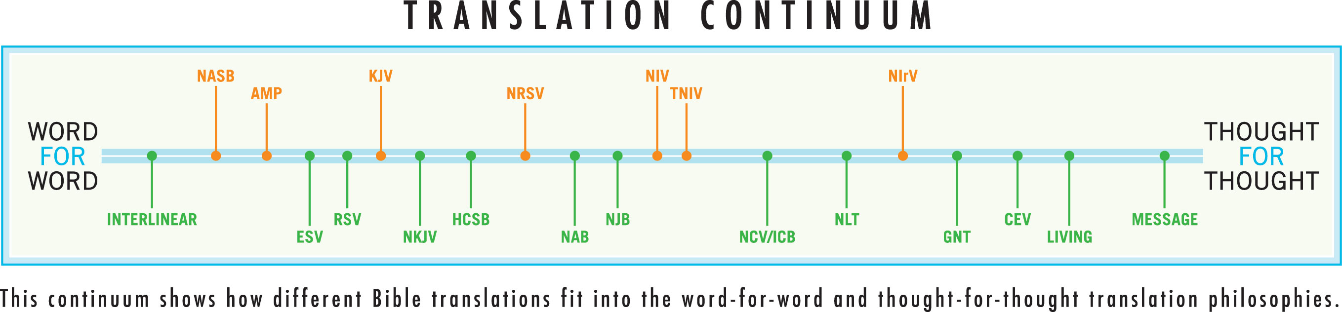 The ones to the right are more meaning-driven – the translators have tried to render the sense rather than the accurate meaning of each word. Sometimes these versions are called paraphrases. We would advise caution when using Bibles that are very meaning-driven, or ‘thought for thought’, because it is easier for translators to introduce their own beliefs about what the text is saying.